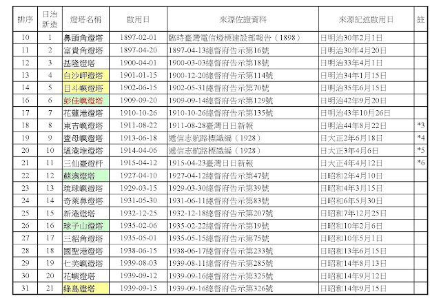 姑且可以視為三期建設,排序編號10~14為第一期,第二期編號為16~21,第三期編號為22~31;完整編表請參閱前作「新版台灣燈塔啟用年表」。